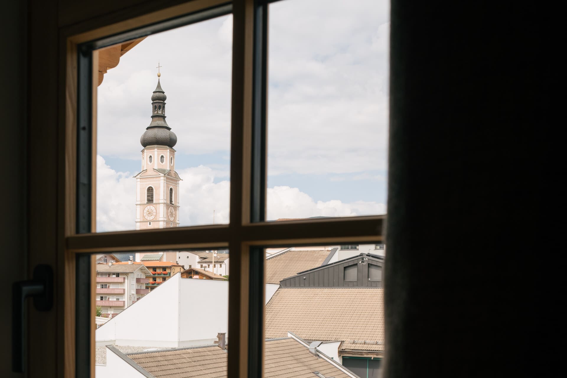 Die „Zwoa“ bietet mit zwei Schlafzimmern auch Familien ein liebevolles Urlaubzuhause. Hier genießt ihr die Abendsonne und den direkten Blick auf den Kastelruther Kirchturm.